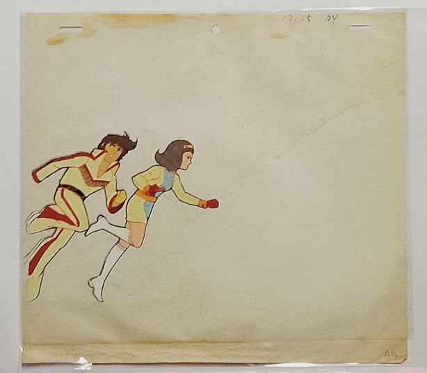 | AD232 | 「鋼鉄ジーグ」(東映版)[司馬宙&卯月美和(ミッチー)]の【セル画】 セル画と原画が貼付 背中側 | 永井豪&安田達矢/原作 中村一夫/キャラクターデザイン | セル画と原画が貼り付いています。 「鋼鉄ジーグ」のアニメは昭和50年〜51年に放映 セル画:横27cm×縦23cm セル画に少汚れ有 原画の左上部にシミ有、原画の右上角部少痛、原画の下フチ部少しわ セル画は、並上 | 3000 | 有 | 260321YS | ||